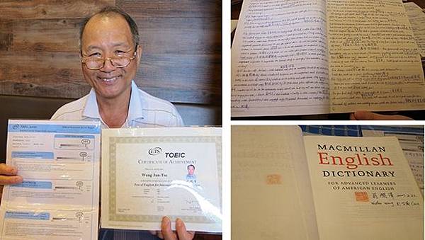 他聽廣播時,會把聽到的寫下來,有空就查意思和用法,加以研讀,多年下來不僅說得一口好英語,一般英語溝通情境或是查詢英語文新知,聽、說、讀、寫都難不倒他。 (本段落及圖片皆擷取自商業周刊)